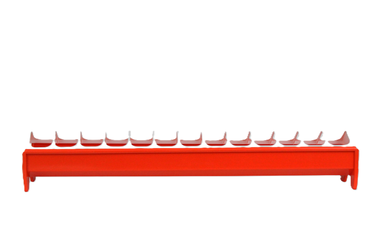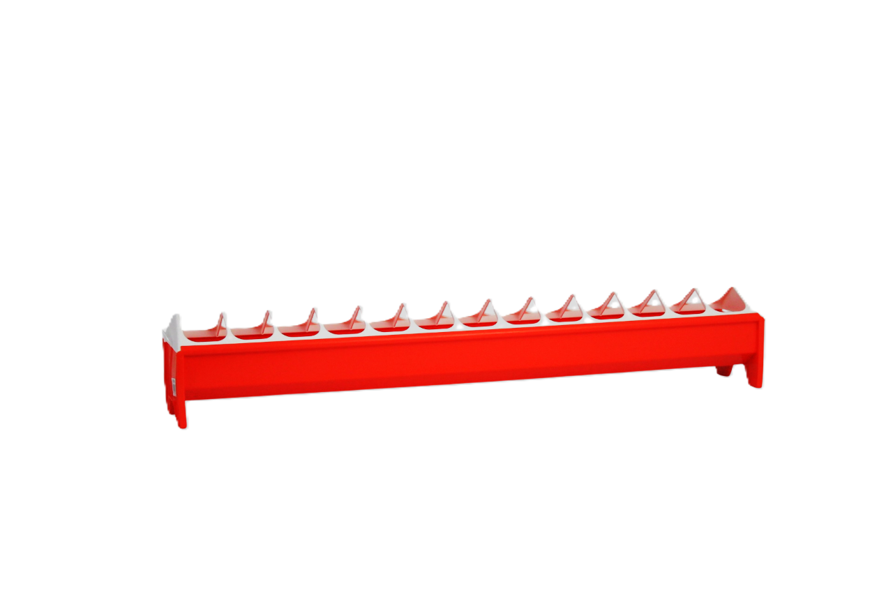 Comedero/bebedero de suelo de 0,75 m en plástico resistente, con separador que evita desperdicio y garantiza acceso equitativo al alimento.
