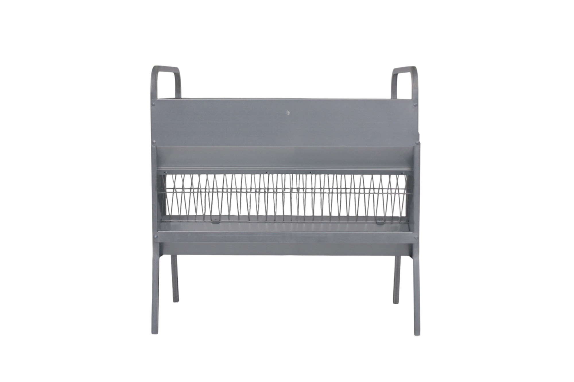 Fabricada en chapa galvanizada, ofrece una alta resistencia frente a la corrosión, la humedad y las condiciones climáticas adversas, siendo apta tanto para interior como para exterior. Incorpora una rejilla inclinada que favorece un consumo natural del heno o forraje y ayuda a reducir el desperdicio, evitando arrastres, dispersión o ensuciamiento del alimento durante la toma.