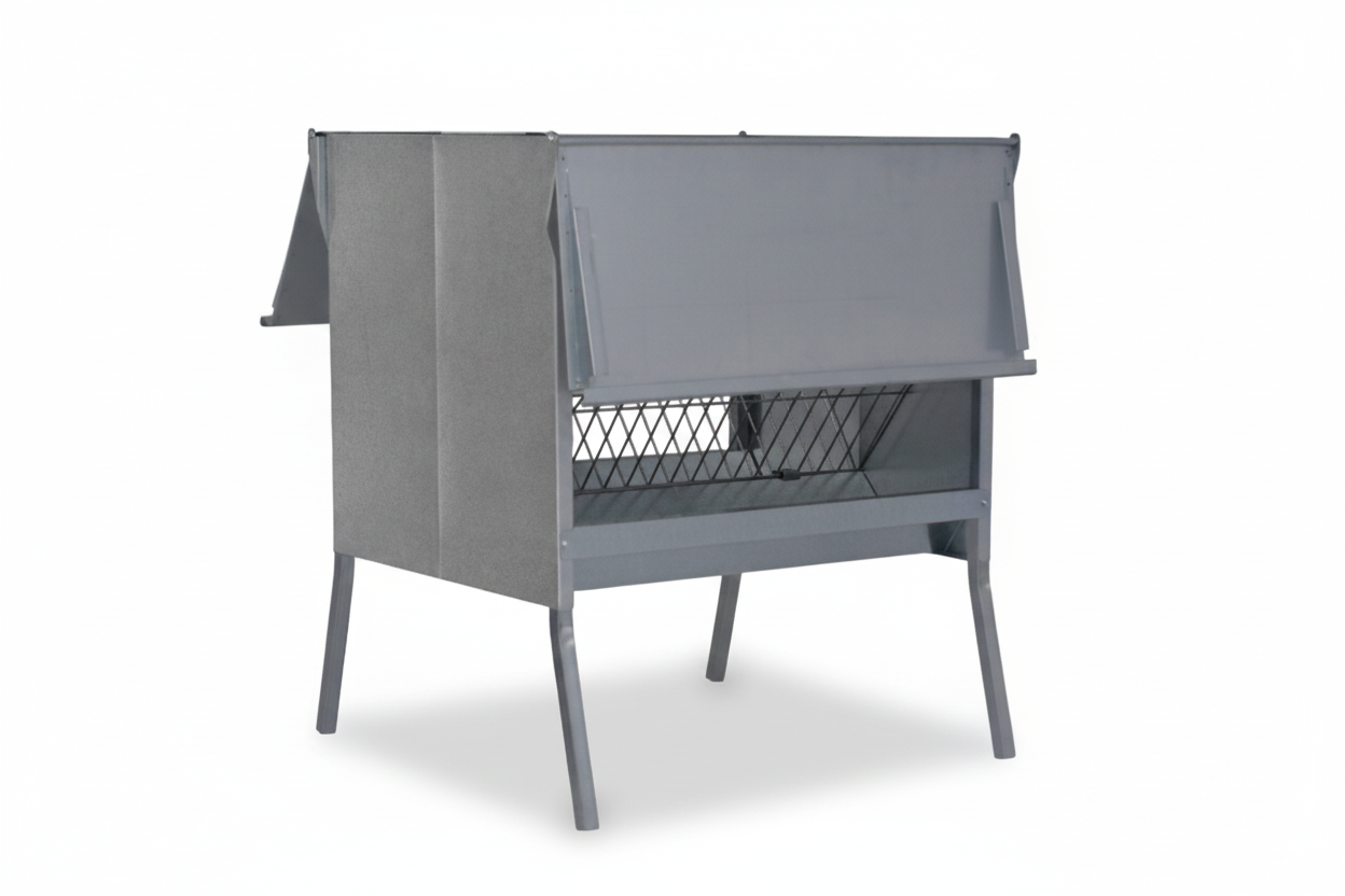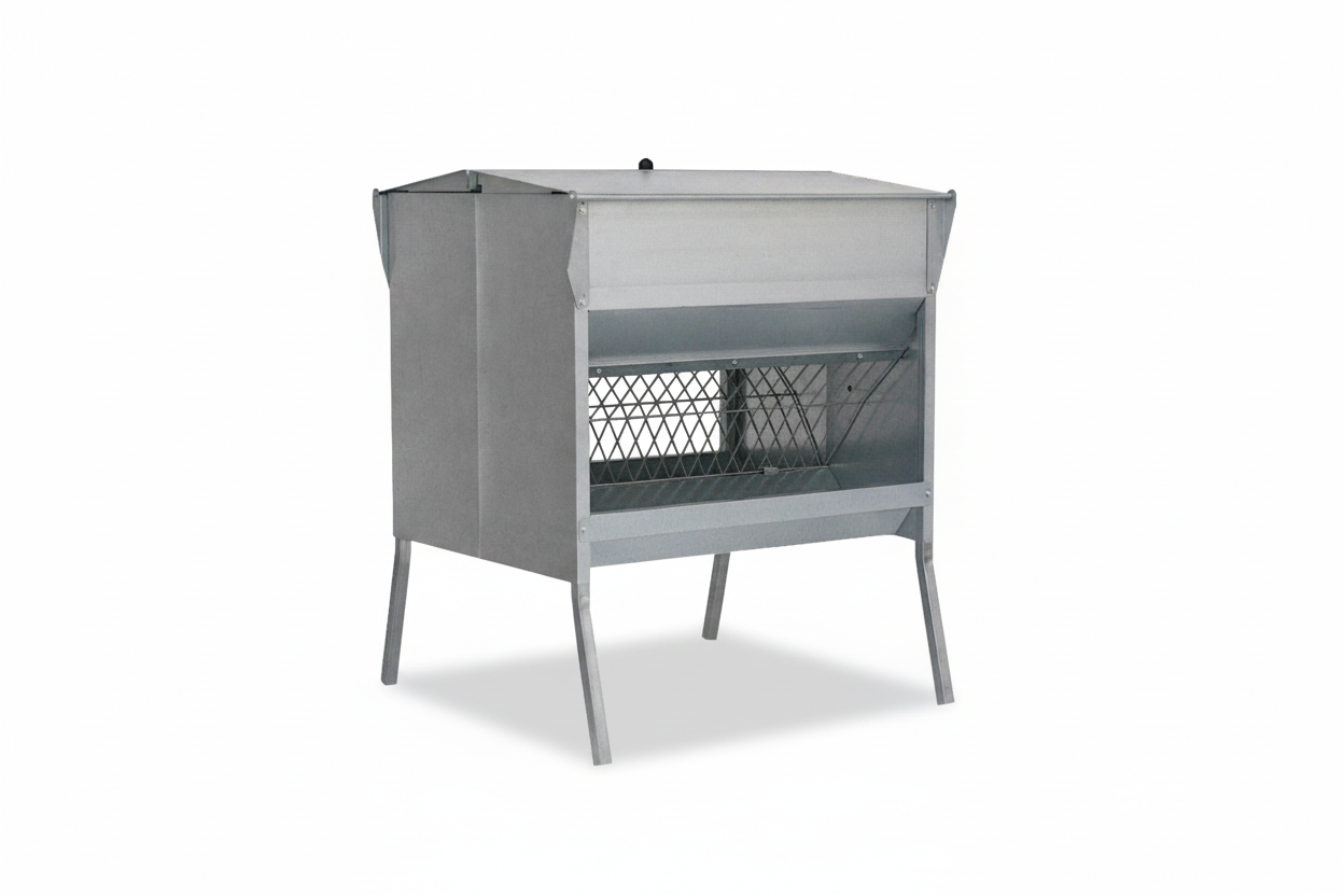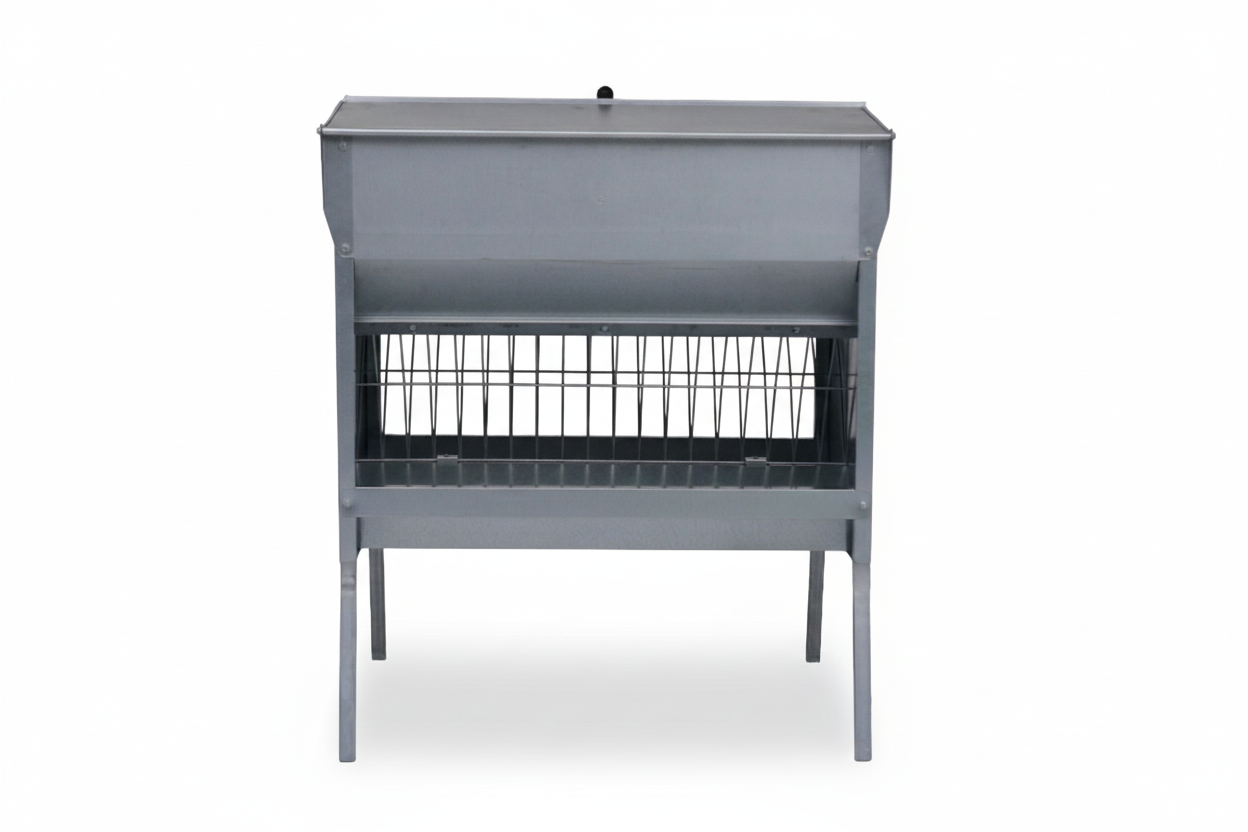 Fabricada en chapa galvanizada, aporta una alta resistencia frente a la corrosión, la humedad y el uso intensivo en granja, siendo apta tanto para interior como para exterior. Incorpora una tapa superior que protege el alimento de lluvia, polvo o suciedad, mientras que la apertura con rejilla permite un acceso cómodo y controlado, evitando que el forraje se arrastre, se disperse o se ensucie durante el consumo.