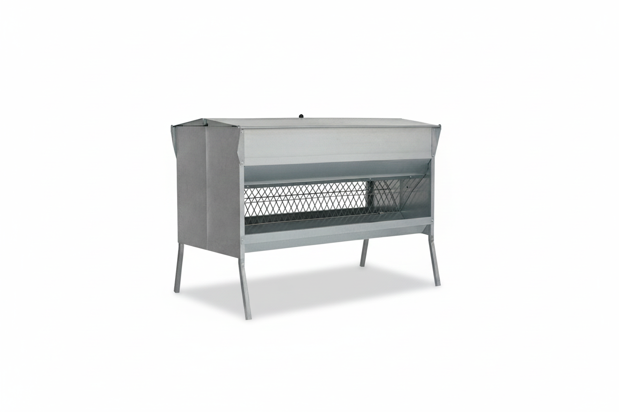 Fabricada en chapa galvanizada, aporta una alta resistencia frente a la corrosión, la humedad y el uso intensivo en granja, siendo apta tanto para interior como para exterior. Incorpora una tapa superior que protege el alimento de lluvia, polvo o suciedad, mientras que la apertura con rejilla permite un acceso cómodo y controlado, evitando que el forraje se arrastre, se disperse o se ensucie durante el consumo.