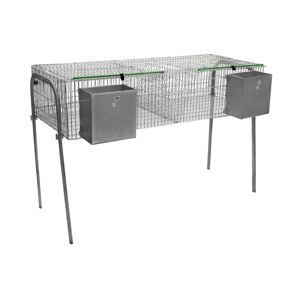 Modelo Económica-8 para engorde de conejos con 2 departamentos, forrajera, comederos de chapa galvanizada de 3 bocas y bebederos de chupete.