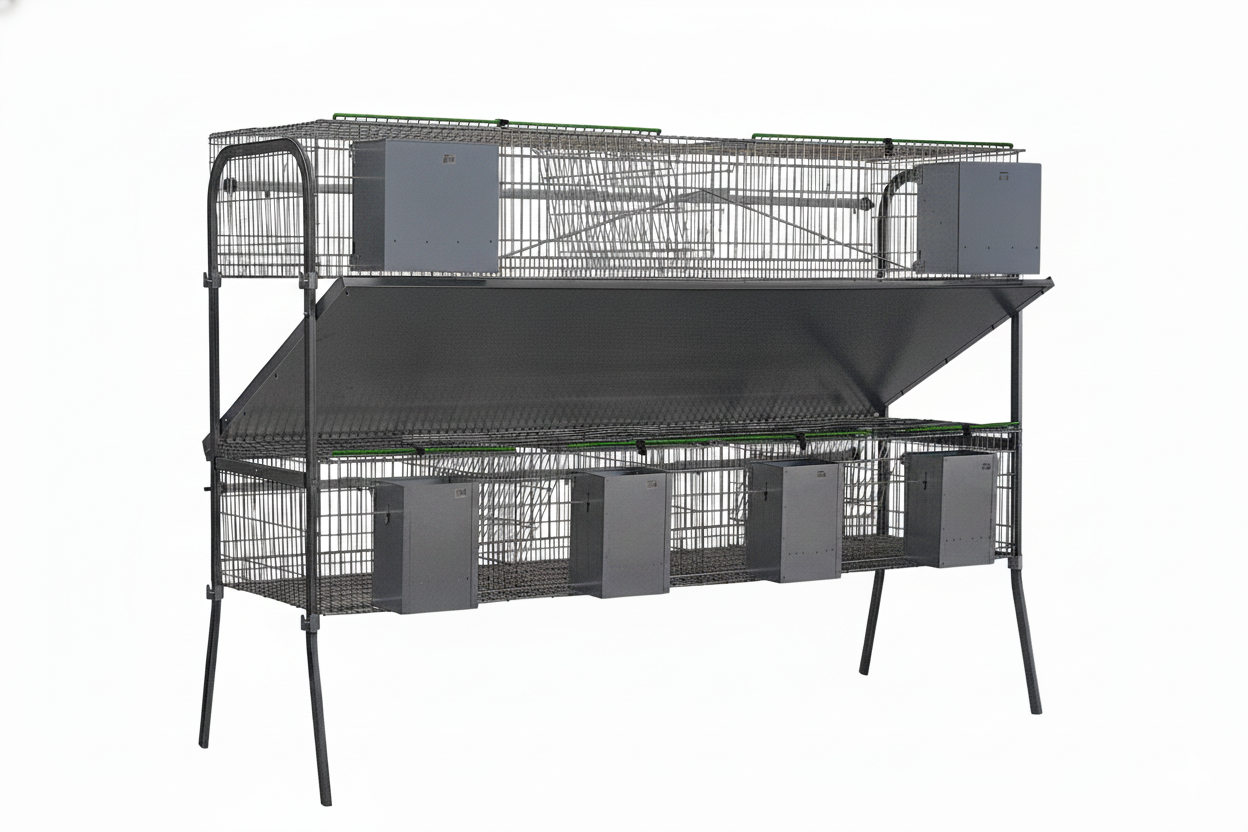 Modelo Económica-9 para conejos con comederos Deluxe de 3 bocas en la parte superior y bebederos de chupete. No incluye nidos.