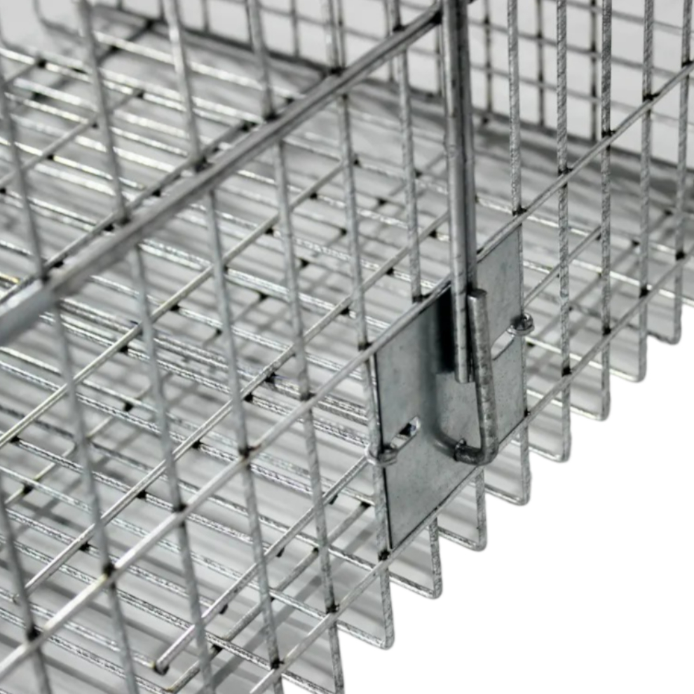 Modelo de captura pequeña en alambre galvanizado con puerta deslizante. Segura, reutilizable y fácil de usar para animales pequeños.