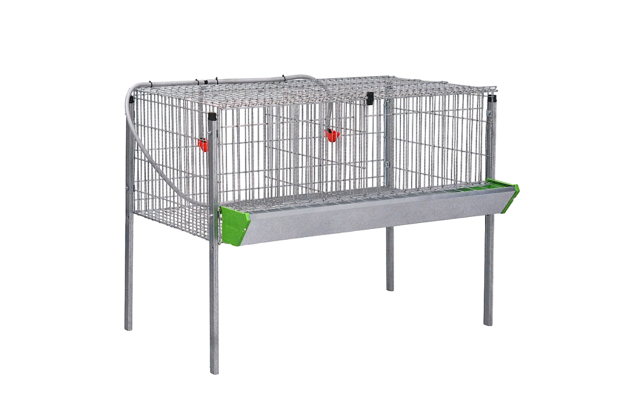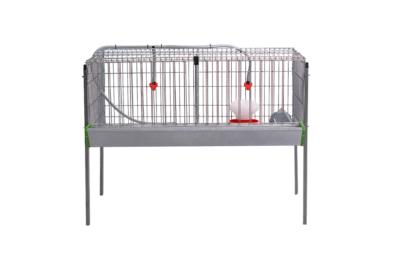 Incluye un comedero frontal con rejilla antidesperdicio y un bebedero de cazoleta por departamento, asegurando acceso cómodo al alimento y agua constante. El frente es regulable para adaptarse al crecimiento de los animales, y de forma opcional se puede añadir un piso de parrilla para utilizar los departamentos en la cría de pollitos.