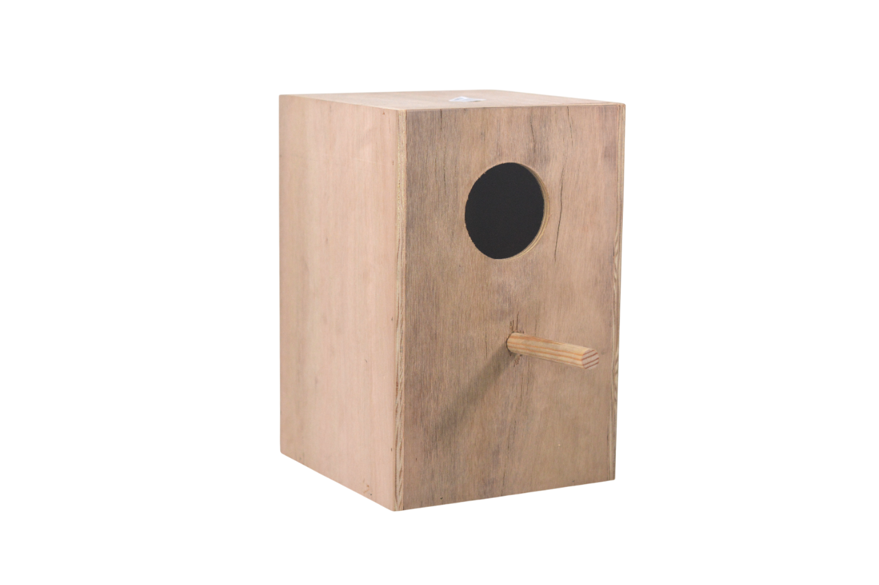Nido de madera para aves, fabricado en madera ideal tanto para exteriores como interiores. Cuenta con una entrada circular y un posadero para facilitar el acceso de las aves.