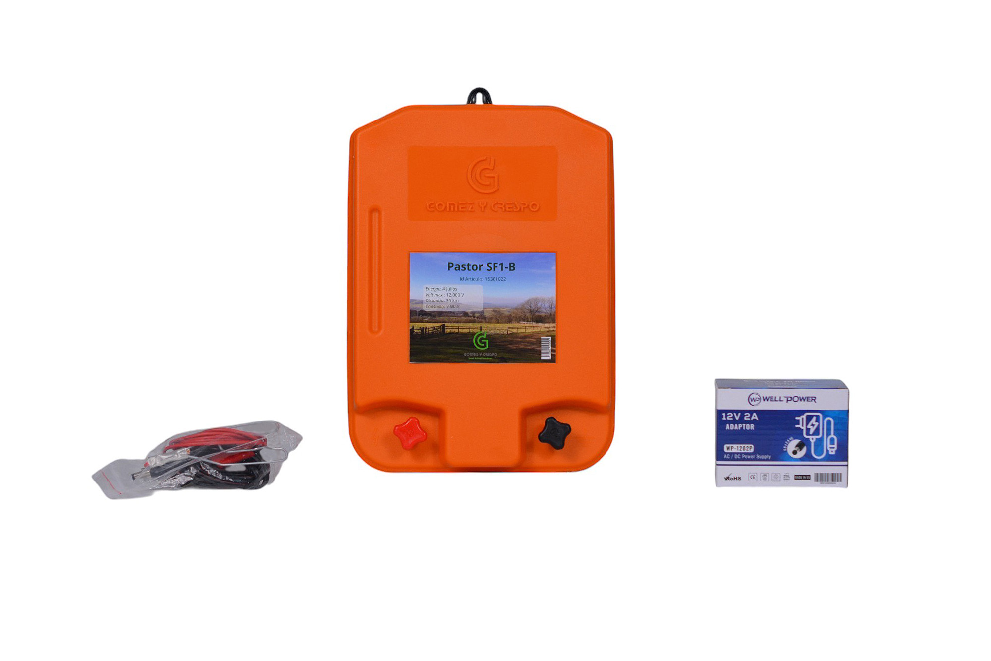 Pastor eléctrico para vallas con alcance de hasta 30 km. Certificación CE, doble terminal y gancho de sujeción. Potente, seguro y duradero.