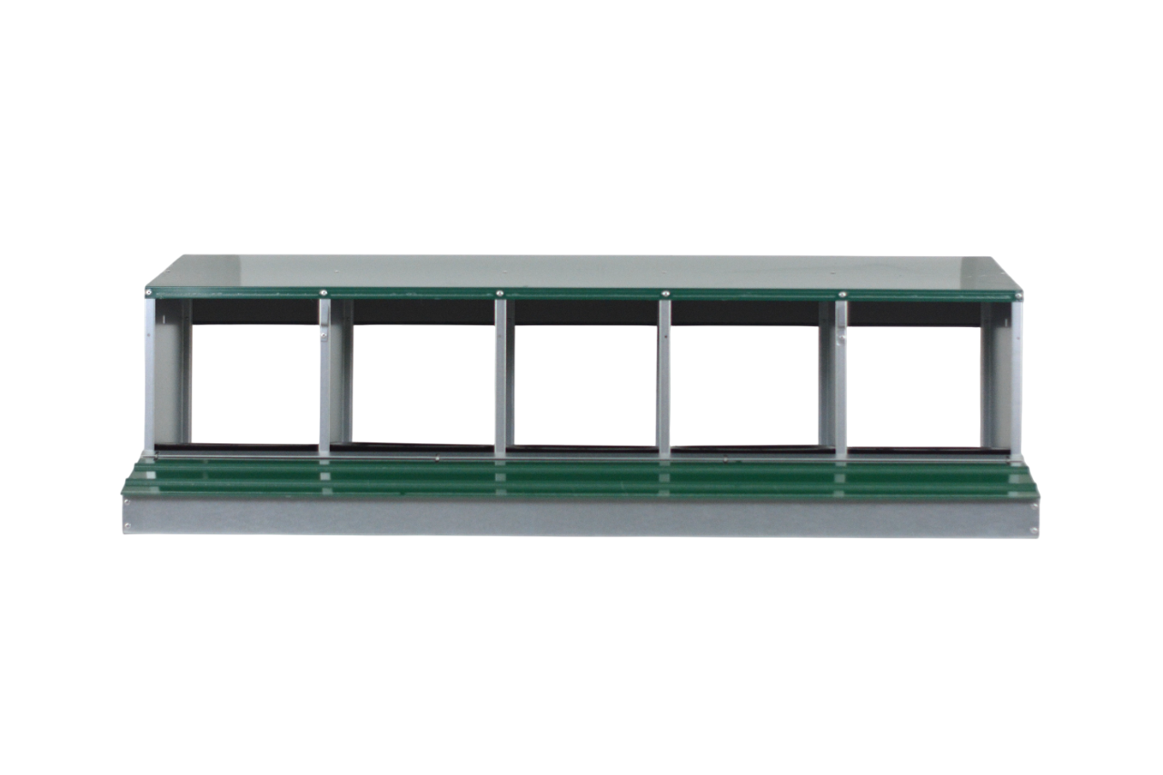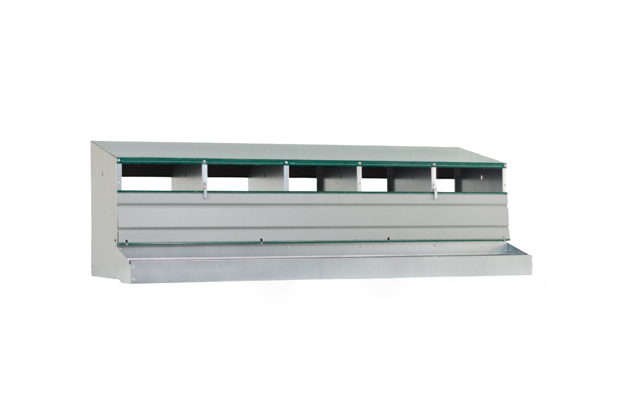 Ponedero galvanizado de 5 huecos con tapa superior y cestas interiores. Diseño cerrado, cómodo y seguro para una puesta ordenada y limpia.