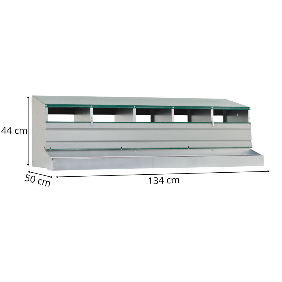 Ponedero de 5 huecos fabricado en chapa galvanizada, ideal para gallineros y granjas avícolas que necesitan ampliar la zona de puesta de forma ordenada y segura. Su diseño cerrado ofrece un ambiente cómodo y tranquilo para las gallinas, favoreciendo una puesta regular.