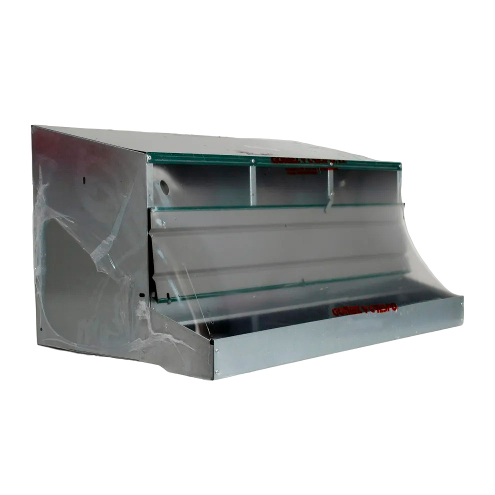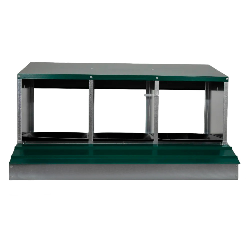 Ponedero de chapa galvanizada con 3 huecos y tapa superior protectora. Diseño cerrado, cómodo y seguro para una puesta ordenada.