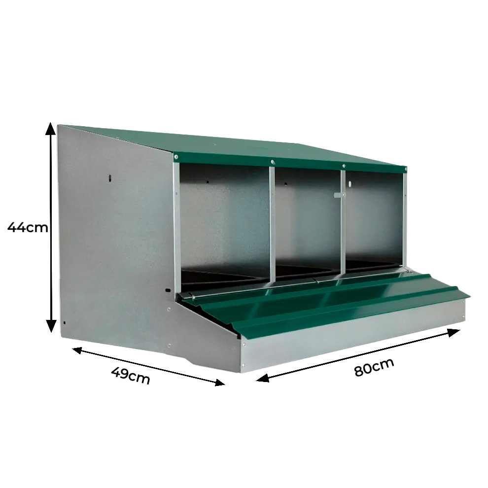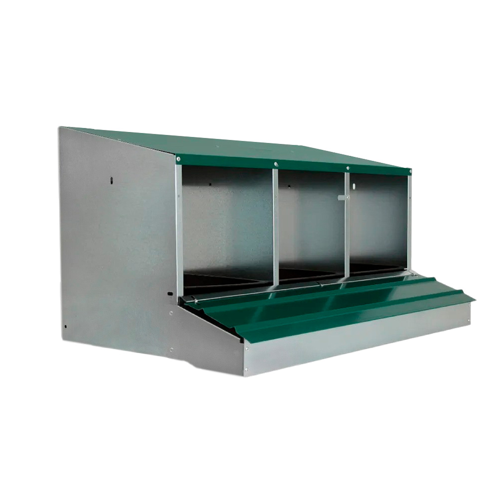 Ponedero de 3 huecos fabricado en chapa galvanizada, ideal para gallinas en criaderos y granjas. Proporciona un espacio cerrado, cómodo y seguro que favorece una puesta regular.