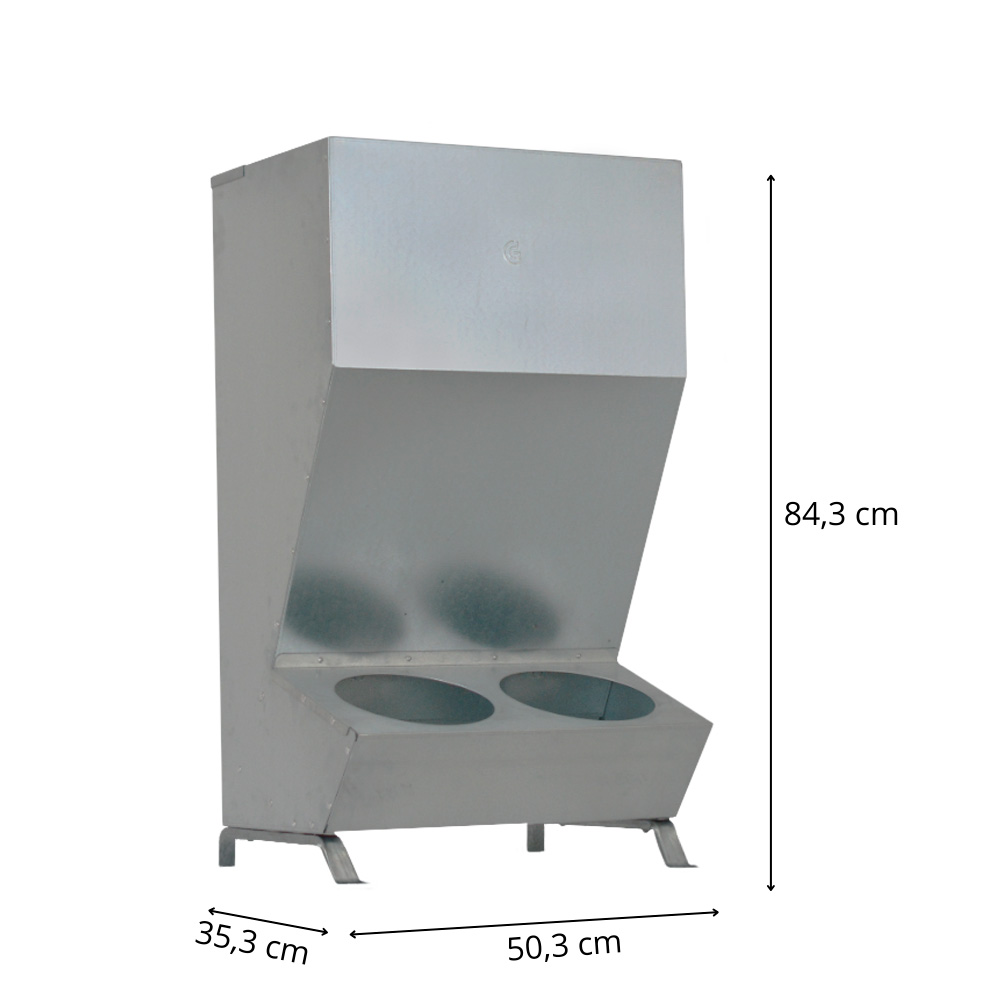 Fabricada en chapa galvanizada, proporciona una alta resistencia frente a la corrosión, la humedad y el uso intensivo propio de estas instalaciones. Sus múltiples orificios de acceso favorecen una alimentación simultánea, ayudan a repartir mejor el alimento entre los animales y reducen pérdidas por derrame o dispersión, manteniendo la zona más limpia y aprovechando mejor el pienso.