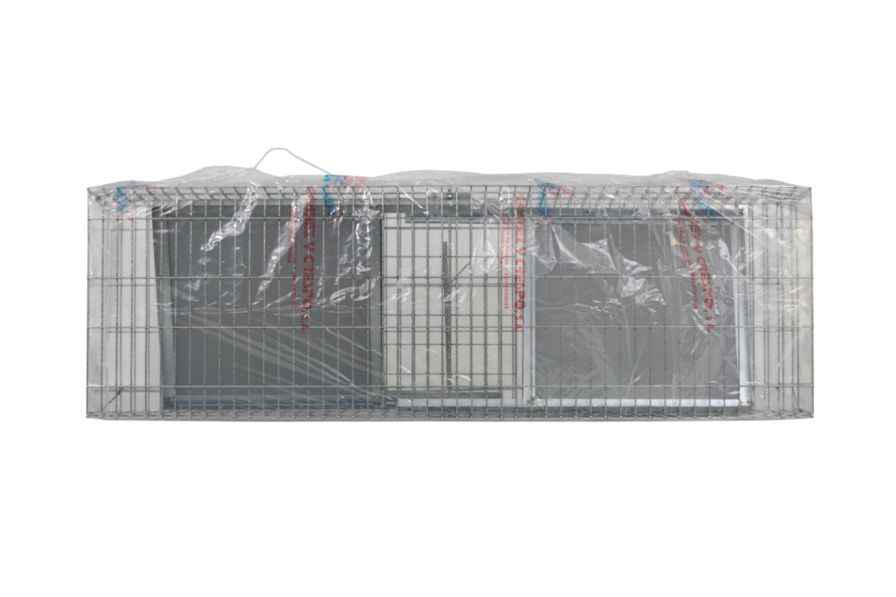 Fabricada en malla metálica resistente, ofrece una estructura robusta, con excelente ventilación y visibilidad, garantizando el bienestar del animal durante el proceso de captura.