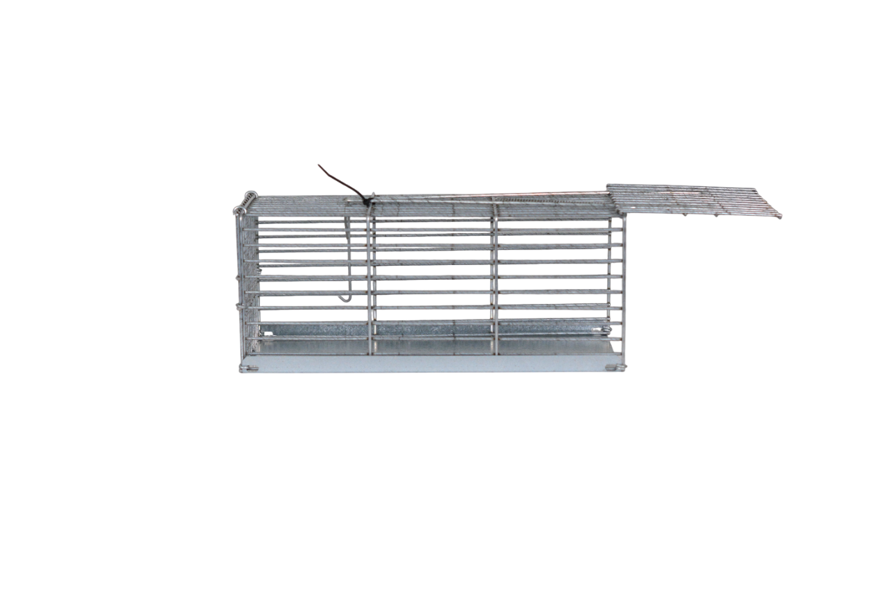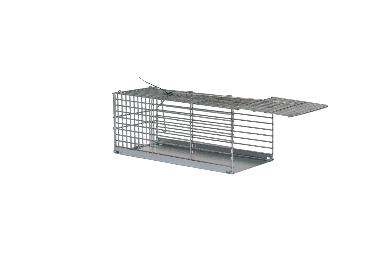 Trampa de captura segura para animales pequeños, fabricada en malla metálica resistente. Garantiza ventilación, visibilidad y una instalación sencilla.