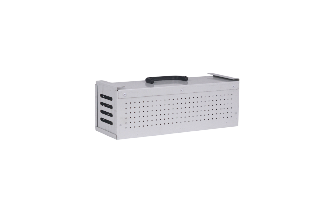 Fabricado en metal resistente, cuenta con múltiples perforaciones laterales y superiores que garantizan una correcta circulación del aire durante todo el transporte, manteniendo al animal en un entorno fresco y ventilado.